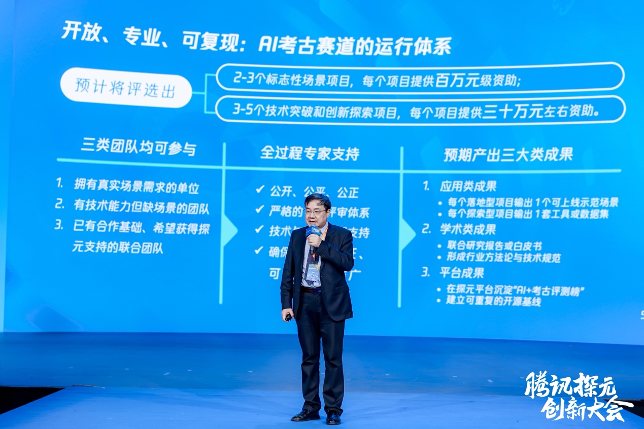 作为“AI 考古”赛道的联合发起方,方辉在主题分享中介绍了该赛道的整体设想与实施机制。他表示,传统考古工作长期面临周期长、对专家经验依赖度高、数据处理效率有限等现实挑战,人工智能的发展为破解上述问题提供了新的技术路径。“探元计划 NextGen”将推动人工智能技术深度融入考古研究与实践,重点从文物智能复原、考古数据的智能分析与规律挖掘、古文字智能识读等方面开展探索。围绕上述方向,“AI 考古”赛道预计将遴选 2-3 个标志性场景项目,每个项目提供百万元级资助,同时支持 3-5 个技术突破和创新探索项目,每个项目提供约 30 万元资助。