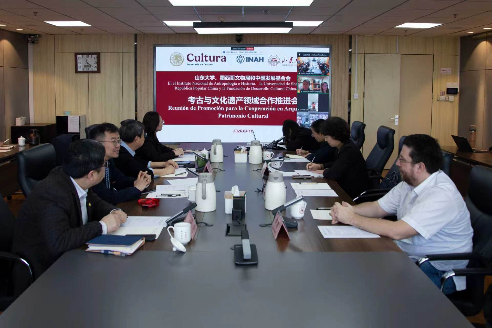 4月10日,由山东大学、墨西哥国家文物局、中墨文化发展基金会共同召开线上线下联席会议,共商推进中墨在考古与文化遗产领域的合作,并就共建中墨考古联合研究中心的筹建工作展开深入研讨。山东大学副校长易凡、墨西哥国家文物局副局长何塞・路易斯・佩雷亚・冈萨雷斯、中墨文化发展基金会会长宁法・蒙塔尼奥、墨西哥尤卡坦半岛华人华侨联合会会长白义、世界著名考古学家乌斯马尔遗址博物馆馆长何塞・乌钦,以及山东大学国际事务部、财务部、考古学院相关负责人出席会议。会议由山东大学文化遗产研究院院长方辉主持。