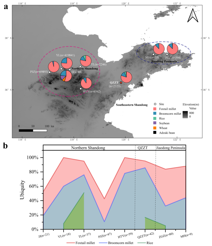 图三 大汶口晚期至龙山时期各遗址农作物的数量百分比(a)与出土概率(b)