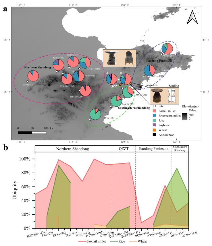 前冢子头遗址的植物考古证据显示,不同时期的作物组合呈现显著动态变化:大汶口晚期至龙山时期(距今约5000–4000年)为以粟为主导、水稻为补充的混合体系。岳石文化时期(距今约4000–3000年)转向以耐旱的粟黍为核心的旱作模式,并保留少量水稻的种植。周代(距今约3000–2200年)的作物组合则以粟为核心、逐步引入小麦且豆类种植稳定,完整呈现了过渡地带的农业适应轨迹。