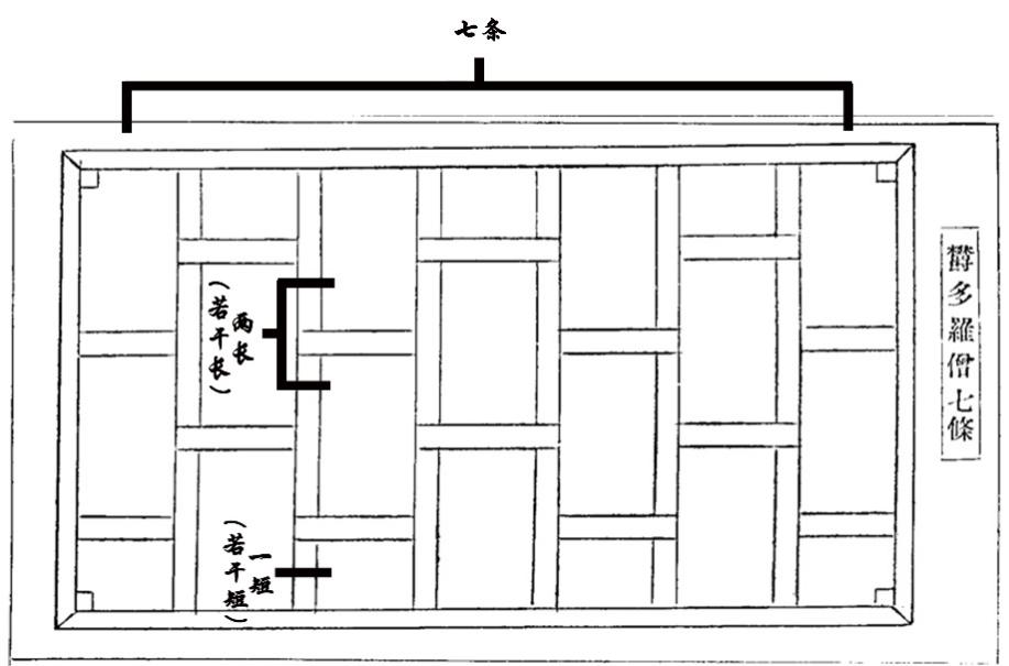 (5)三衣形状。三衣以“条”数区别,僧伽梨9条、欝多罗僧7条、安陀会5条。《十诵律》卷五《明三十尼耆法》载:“用作僧伽梨最下九条,成分别若干长若干短,总说九条……用作欝多罗僧七条,成分别若干长若干短,总说七条……用作安陀卫五条,成分别若干长若干短,总说五条。”