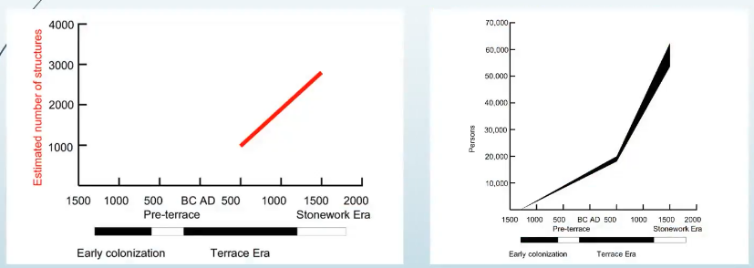 为了探索从土台时期到石头村时期社会转变的机制,蔡老师对两个时期的人口分布模式与农业生产力的关系进行了分析。她先对帕劳岛屿土地的生产力进行了计算,随后将人口密度与农业生产力进行了相关性分析,发现石头村时期的人们倾向于选择居住在生产力较高的土地旁边,而更早的土台时期的人们,似乎出于对特定的防御需求,往往会选择居住在山顶与陡坡,以组成防御网络,保护土地的安全。蔡老师提出,两个时期存在两种人地关系,土台时期的人们追求种植周期的密集化,热衷于拥有更大的土地面积,邻舍之间的关系较为紧张,而到了石头村时期,人们则倾向于景观资本的密集化,注重提高单位土地的产量,强调邻舍间的经济合作。