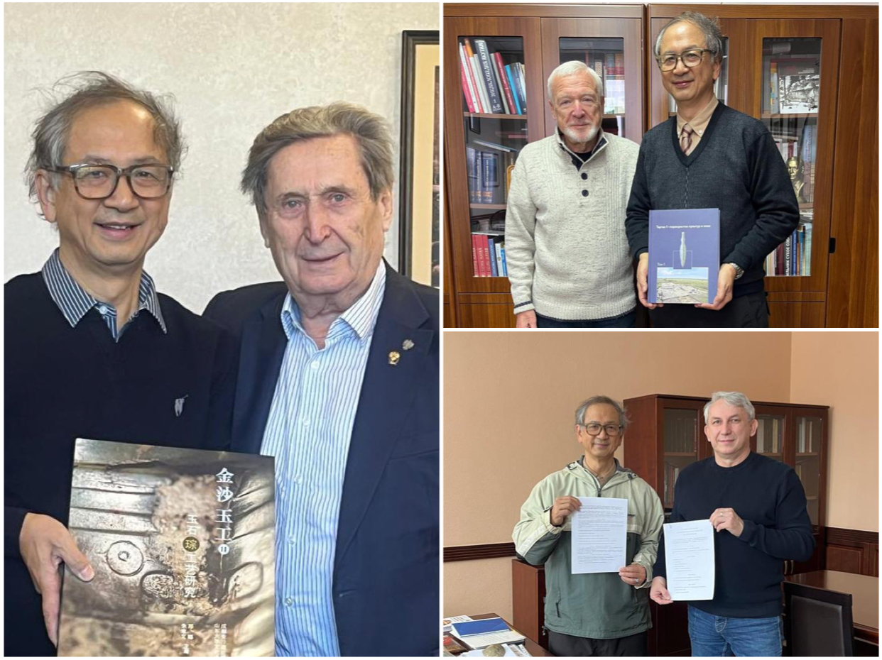 山东大学邓聪教授访问俄期间,与阿纳托利·杰列维扬科院士(左)、莫罗金·维亚切斯罗夫院士(右上)、安德烈·克里沃沙普金通讯院士(右下)交换出版物并拟定合作协议