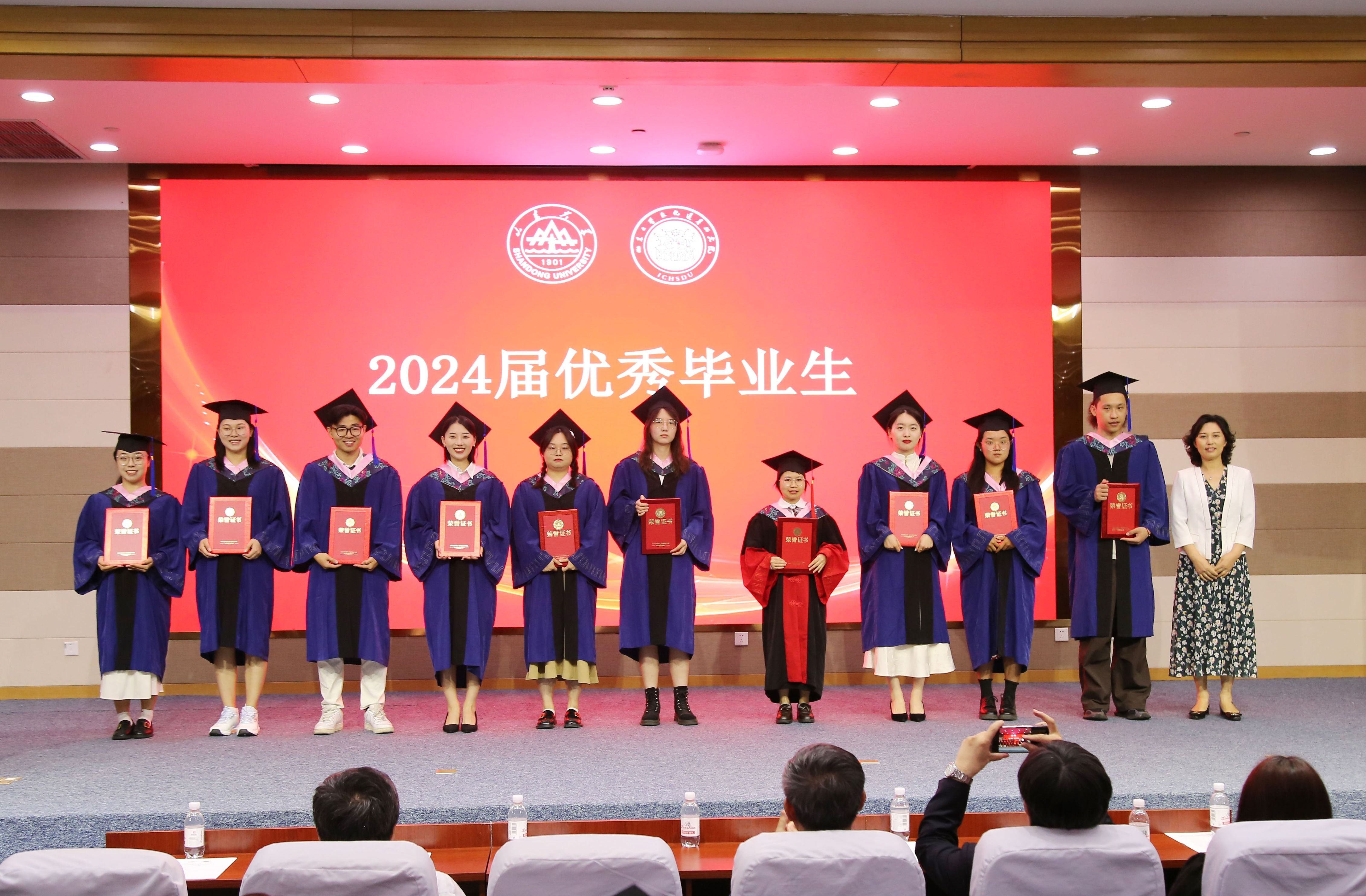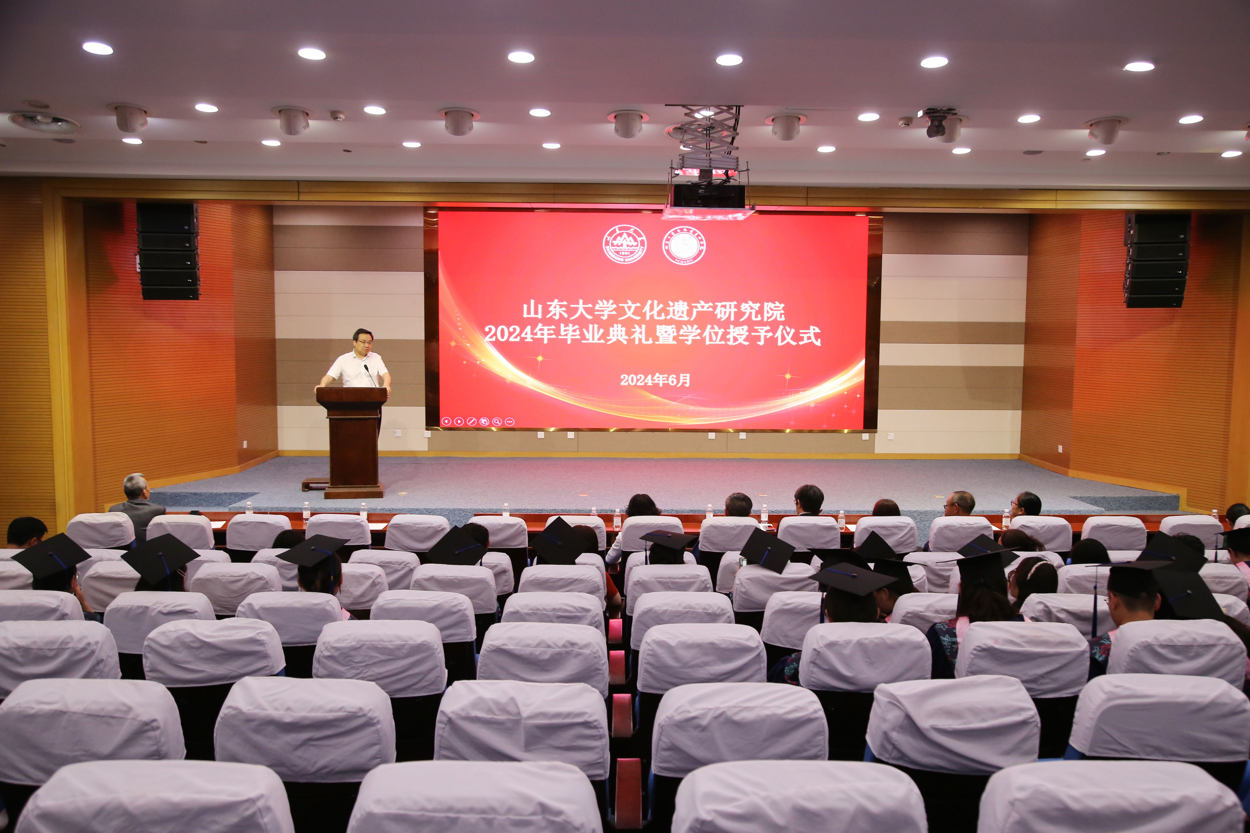 毕业典礼在庄严肃穆的国歌声中拉开帷幕。随后,李力宣读了《山东大学关于表彰2024届优秀毕业生的决定》《关于聘任张新天等人2024届校友班级理事聘任决定》,刘军、陈雪香分别为获评山东大学优秀毕业生、文化遗产研究院2024届校友班级理事的同学颁发了证书。
